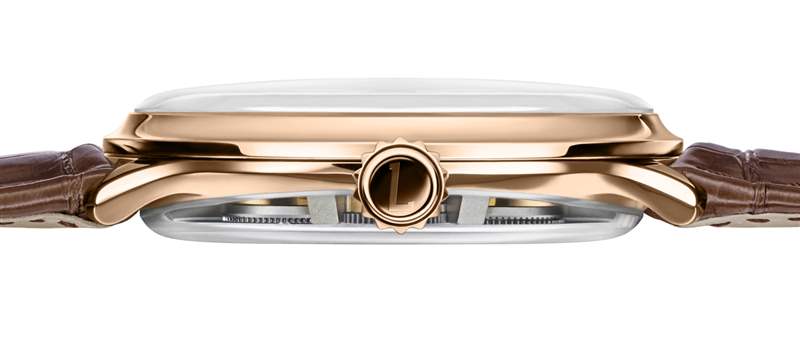 Central Impulse Chronometer 44 毫米寬表殼(防水深度達 30 米)的背面采用盒形藍寶石水晶鏡面。它提供了運動的美麗廣闊的視野。有兩個版本的表盤可供選擇——帶或不帶部分鏤空,以欣賞更多的動畫機制。盡管表殼只有 12.2 毫米厚,??但由于透明底蓋和視覺上很薄的金屬外殼組件的存在,它在視覺上變得更薄。