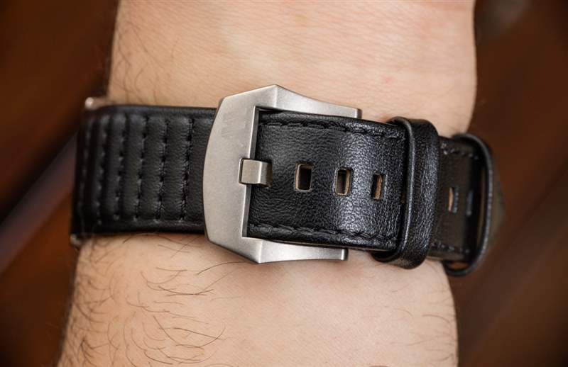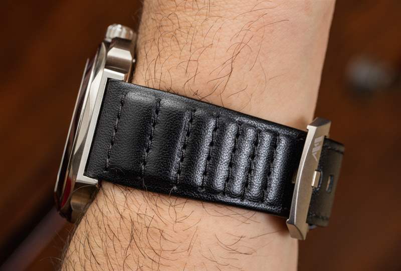 Montfort 自豪地用“超級不銹鋼”制作 Strata 的 44 毫米寬表殼。這是他們對一種特殊硬化鋼的名稱,這種鋼的表面密度比其他標準鋼表更高。實際結(jié)果是表殼比類似的鋼表更耐刮擦。表殼的磨損比它可能暗示的 44 毫米寬尺寸要小一些,這是因為它的厚度剛剛超過 10 毫米,以及相對較短的(寬度)47 毫米的凸耳到凸耳的距離。此外,由于表耳的樣式,折疊的地方?jīng)]有長長的“角”伸出。
