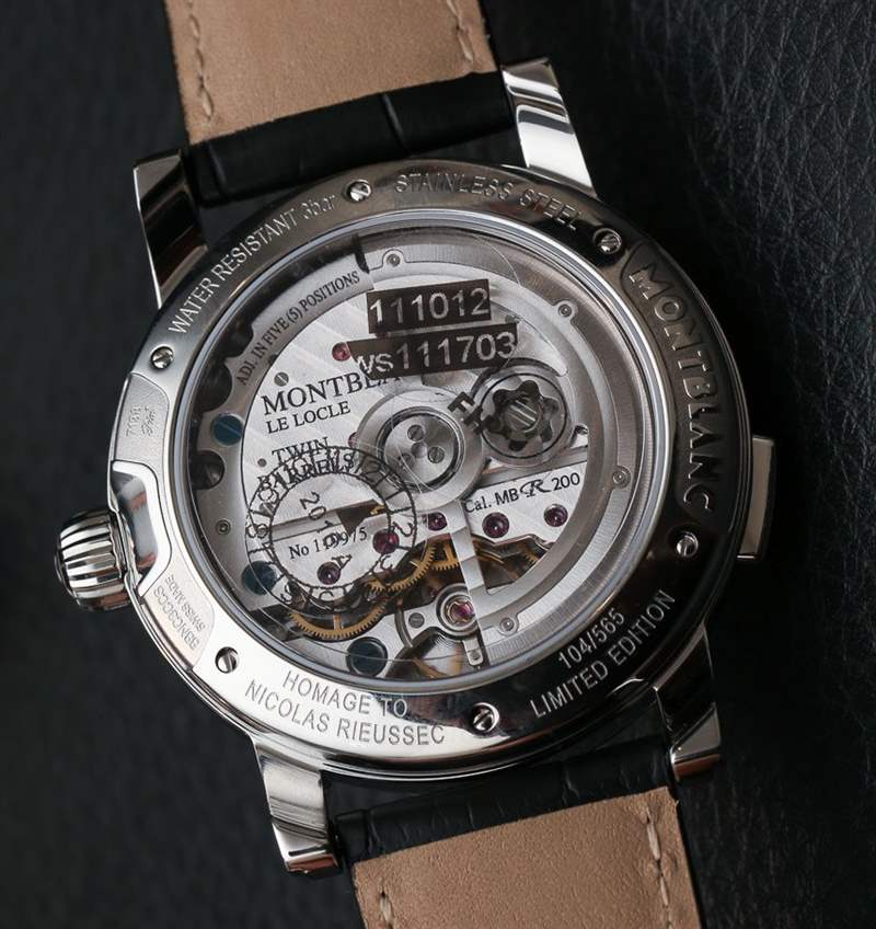 透過藍寶石水晶底蓋可見瑞士力洛克自制MB R200自動機芯。這個 4Hz 機芯代表了萬寶龍的 ETA 機芯和他們更高端的萬寶龍 Villeret (Minerva) 生產的機芯之間的中間值。這款手表的時間帶有第二時區指針(基本上是一個額外的時針)、晝/夜指示器、日期和通過單按鈕(單按鈕計時碼表)操作的 30 分鐘計時碼表。該機芯具有 3 天(72 小時)的良好動力儲存。