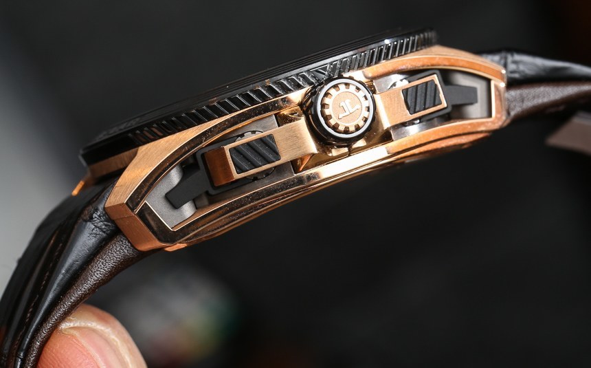 Extreme Lab 2 外殼高 16.5 毫米,肯定不薄,但它本來可以厚得多。積家 (Jaeger-LeCoultre) 設法擠出 100 米的防水性能,即使底蓋上的非圓形藍寶石水晶顯示了機芯的視圖——以及所有按鈕。表殼周圍是一個按鈕式表冠(它像按鈕一樣推入以選擇功能而不是被拉出),兩個計時碼表按鈕和一個位于表殼左側的滑動桿。這導致了一些值得注意的有趣的功能選項。