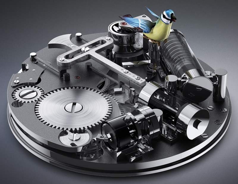 雅克德羅 (Jaquet Droz) 及其同時(shí)代人(見(jiàn)此處)在 18 世紀(jì)制作的博物館藏品通常采用自動(dòng)機(jī)鳥(niǎo)的形式,旨在以令人毛骨悚然的細(xì)節(jié)模仿真實(shí)鳥(niǎo)類(lèi)的動(dòng)作和聲音。通過(guò)將活塞式管快速移入和移出豎井來(lái)產(chǎn)生鳥(niǎo)鳴。一個(gè)小氣孔會(huì)發(fā)出哨聲,聽(tīng)起來(lái)非常像一只真正的鳥(niǎo)。機(jī)械鳥(niǎo)雕像通常設(shè)計(jì)有可移動(dòng)的頭部、翅膀,甚至喙。這些機(jī)器通常是華麗鐘表的一部分。