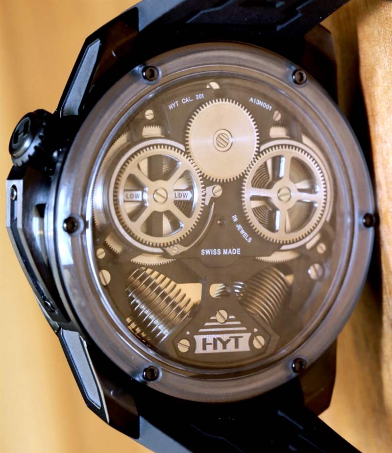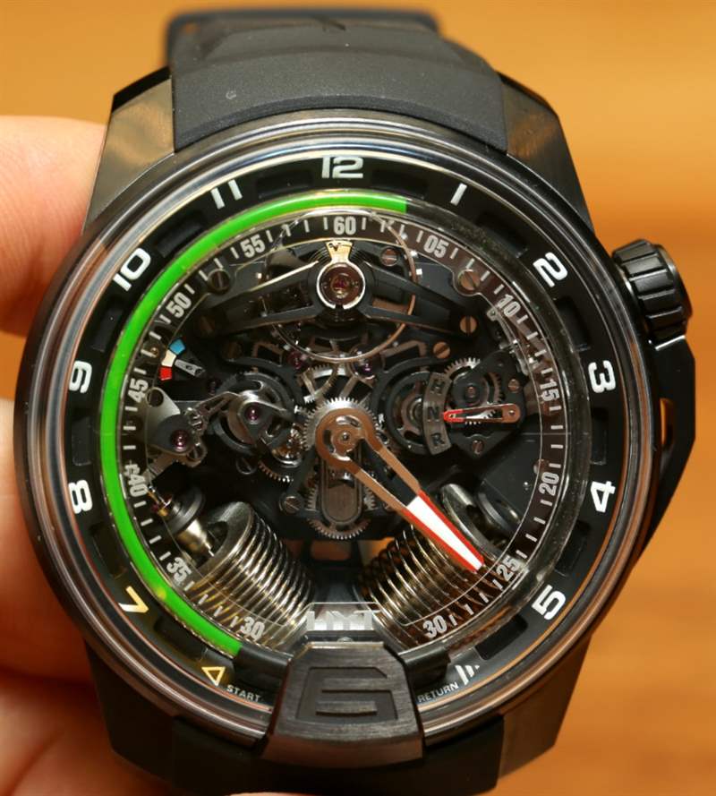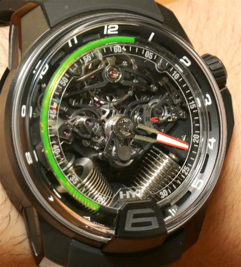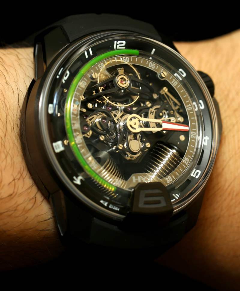 如果您閱讀過(guò)我們首次發(fā)布 H2 的文章,您就會(huì)了解其近 49 毫米寬的尺寸和黑色 DLC 涂層鈦金屬表殼。在手腕上,它不僅感覺(jué)像一個(gè)小型發(fā)動(dòng)機(jī),其新對(duì)角對(duì)齊的波紋管的方向就像發(fā)動(dòng)機(jī)中的活塞。波紋管是液體小時(shí)系統(tǒng)的一部分,并與運(yùn)動(dòng)一起使用壓力移動(dòng)液體以指示小時(shí)。分鐘顯示在一個(gè)更大的中央分針上,它完全跳過(guò)表盤的底部,就好像它根本不存在一樣。它是跳分針的一種形式。表盤頂部附近還有一個(gè)大的外露擺輪。它看起來(lái)很棒,但如果他們將陀飛輪扔進(jìn)鍋里,很可能已經(jīng)毀了。廣告留言廣告信息結(jié)束
