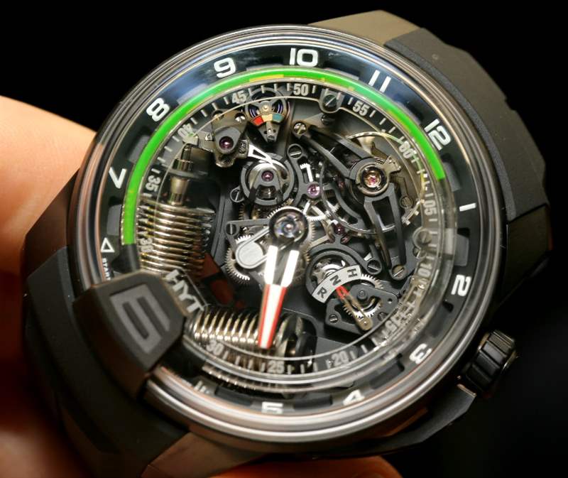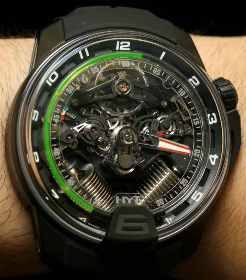 我們與HYT手表的會(huì)面?是在2013年Baselworld的第一天很早的時(shí)候。我們?cè)贖YT品牌展位還沒(méi)有完全布置好之前就到了。我們周圍的人正在展示并安排相鄰的展位,以迎接 2013 年的媒體、買家和公眾。HYT 首席執(zhí)行官 Vincent Perriard 正忙著檢查他即將舉行的新聞發(fā)布會(huì)的麥克風(fēng),并確保時(shí)髦的黑色和綠色展臺(tái)周圍的小細(xì)節(jié)恰到好處。這是 HYT 第二年參加 Baselworld,這是鐘表行業(yè)資深人士 Perriard 極其熟悉的貿(mào)易展覽活動(dòng)。今年新展臺(tái)更大更好,他推出了他們的第二個(gè)主要作品H2(在 aBlogtoWatch 上首次亮相)
