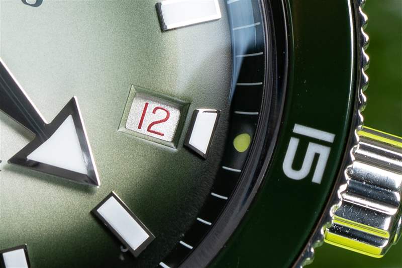 庫克船長系列的標志是其體育場表圈。硬幣邊緣經過完全拋光,綠色陶瓷嵌件也是如此,其上刻有 Super-LumiNova 填充標記。與扁平邊框類似,但外觀更酷,這種風格最大化了握持面積,同時最小化了高度,而更常見的凸形邊框通常會導致更高的高度或更少的握持力。可以肯定的是,卡梅倫諾里庫克船長通過了我嚴格的表圈測試:當我的手和表圈都是濕的時(在我兒子洗澡時和在海里時),我能夠旋轉它。高度的比例優勢也很明顯,腕表厚度為 12.3 毫米,佩戴起來非常舒適,尤其是對于 42 毫米、300 m WR 腕表而言。雖然它不是瑞士 300m 跳水運動員中最瘦的,但它擊敗了歐米茄海馬和勞力士潛航者,前者的表圈在潮濕時毫無用處。