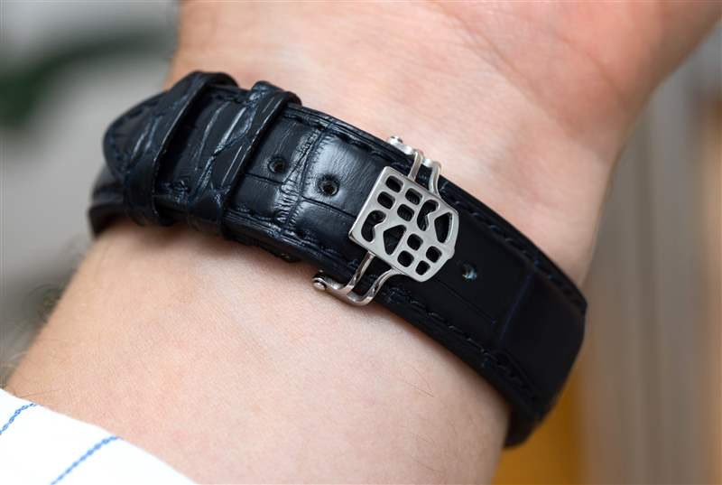 戴在手腕上,自制經典陀飛輪腕表給人一種真正優雅的感覺,專為日常佩戴而設計——也就是說,在辦公室里日常佩戴。這不是“看看這個!”?陀飛輪的展示只是為了將其置于敲詐比特幣百萬富翁沖動購買者的范圍內。這是一款相對低調、內斂的手表,看起來復雜而昂貴,但絕不令人討厭或礙眼。人們很容易想象跨國公司的高級經理或工程師會穿著它。簡潔的細節包括,單個生產編號不僅可以在底蓋上讀取,還可以在陀飛輪框架的頂部讀取——功能性機芯組件具有如此程度的定制是很少見的。擒縱輪上刻有康斯登標志,閃爍著紫色和藍色的光芒,這是因為它是由硅制成的。該品牌使用的不僅僅是這個組件 – 了解他們的 40Hz(是的,四十赫茲)這里采用硅制成的整體式擒縱機構。折疊扣上還帶有品牌標志,這是一個不錯的主意,盡管執行起來并不像某些人想象的那么清晰。